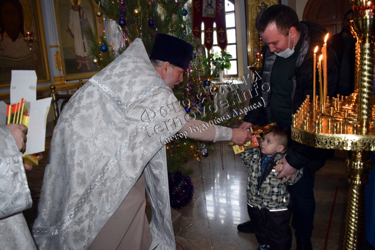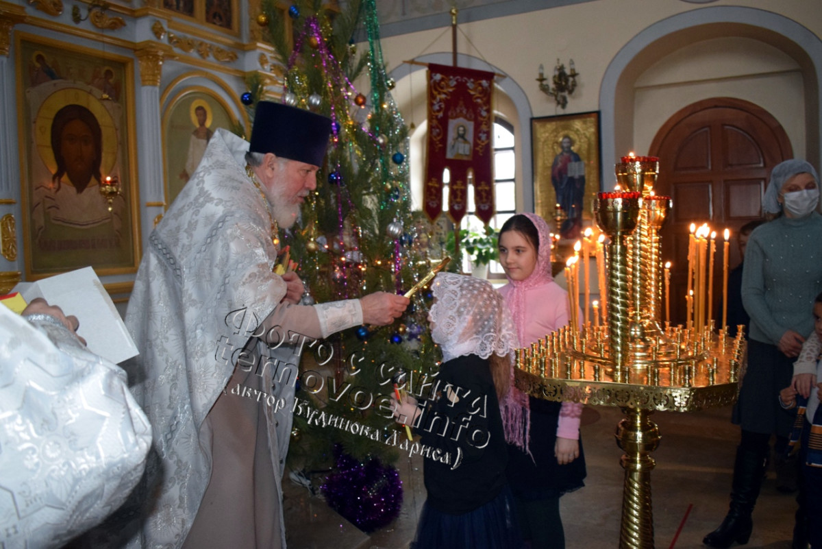 Настоятель храма отец Сергий поздравил всех с Рождеством Господа и Спаса нашего Иисуса Христа и вручил сладкие подарки.