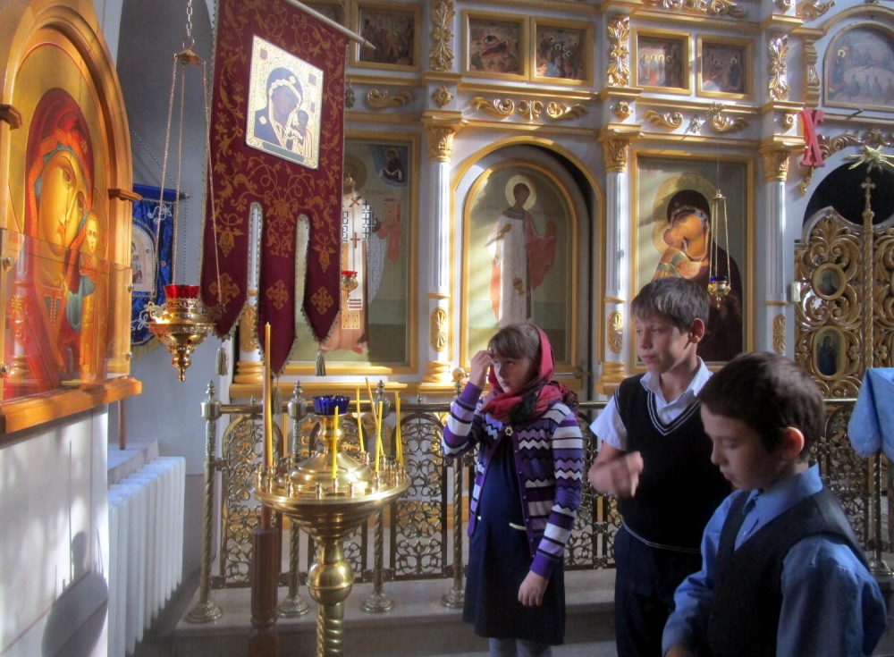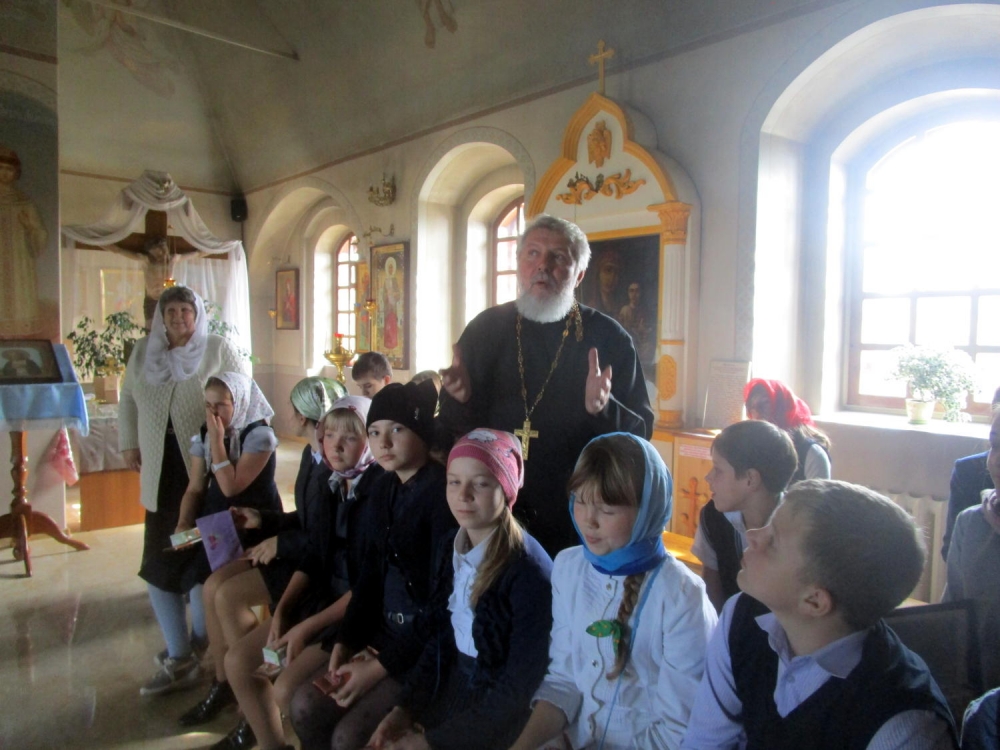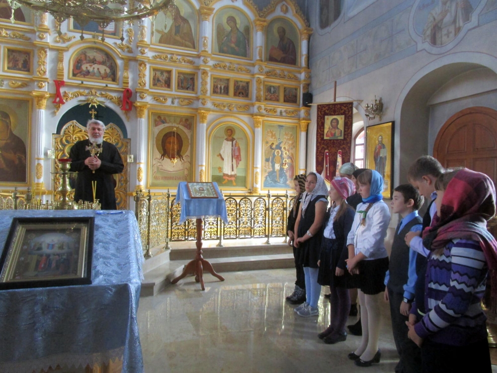 Настоятель храма отец Сергий, матушка Евдокия и ребята повели разговор о Святой заступнице Руси — Богородице. Отец Сергий рассказал о том, что с XII века на Руси весь православный люд празднует Покров Пресвятой Богородицы 14 октября.