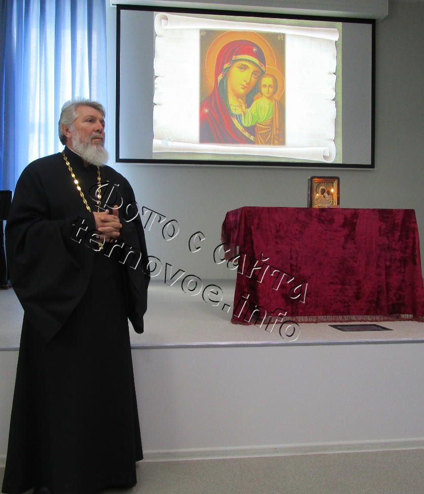 На встрече батюшка рассказал ученикам и их наставникам, что этот день осуществляется празднование в честь Казанской иконы Божией Матери.